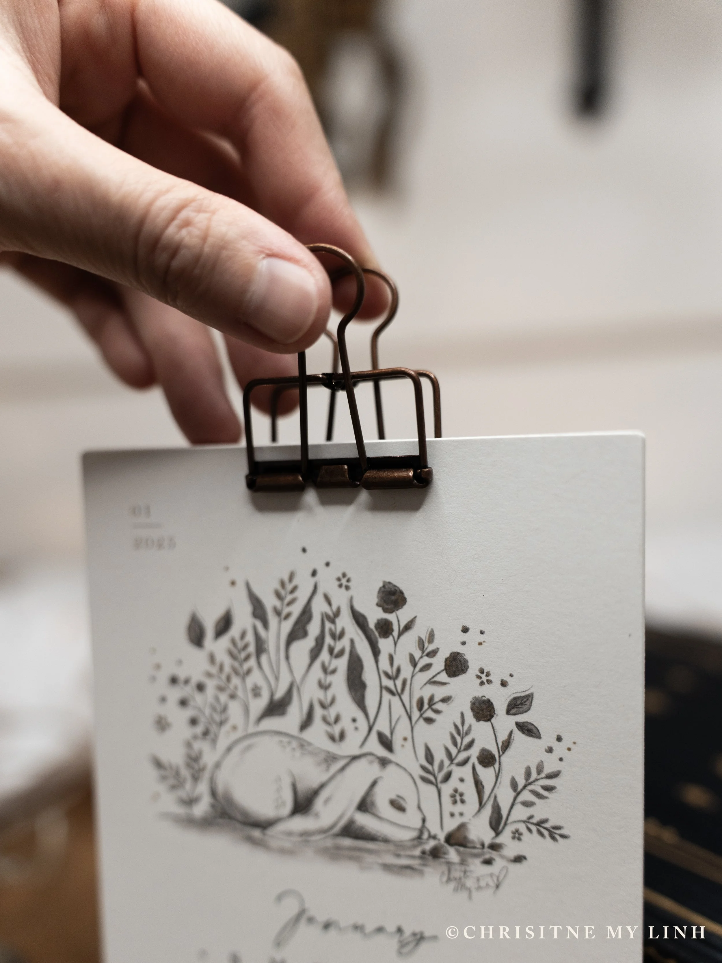 12-month calendar story set for 2025, featuring a double-sided design, with an illustration, calendar, and week numbers on the front and the story of the Bunny and Bear on the back.